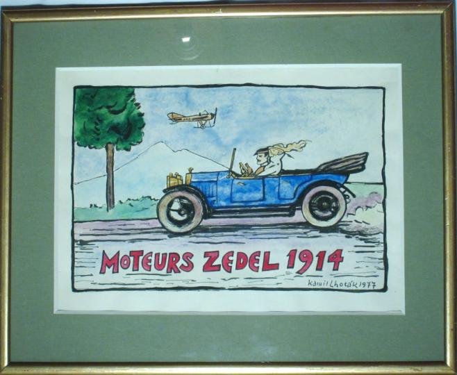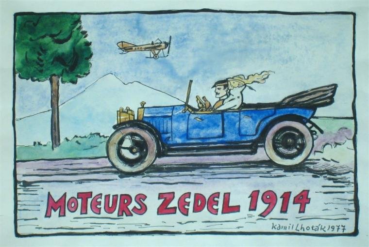 Tmavomodrý starý automobil kabriolet, s mužem v čepici za volantem a ženou v bílém s vlající šálou. Automobil s otevřenou plátěnou střechou, bílými pneumatikami drátovými koly v plné rychlosti. V pozadí vlevo zelený strom a lehce naznačený kopec. Na modré obloze žluté letadlo z doby zrodu aviatiky. V prvním plánu dole velký červený nápis "moteurs zedel 1914".