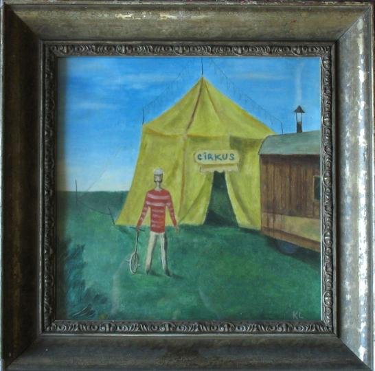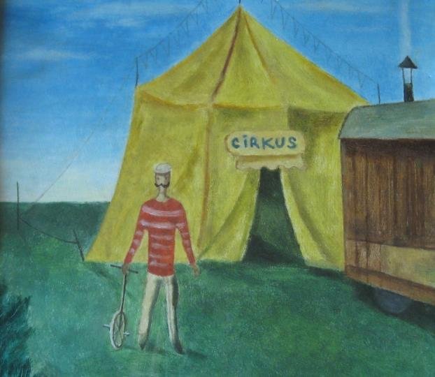 Popis díla:cirkusové šapito, v první linii artista s jednokolkou, vpravo dřěvěná maringotkaekonomický odhad 620/2010