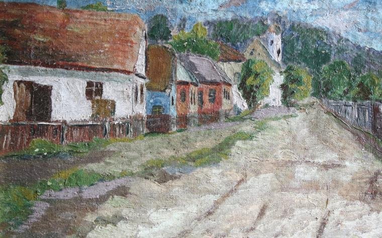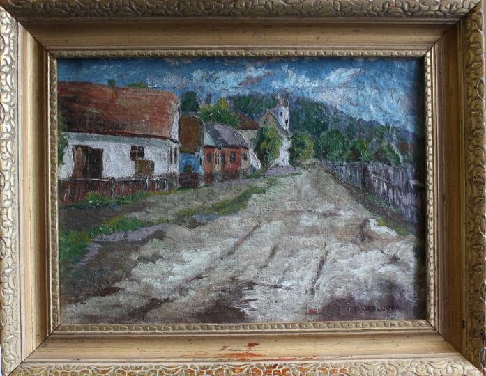 Popis díla:původní rám i bildrámznalecký posudek č.590/2009Pohled na chalupy s cestou, v pozadí kopec a vpravo ploty od zahrad.Stáří cca 100 let.