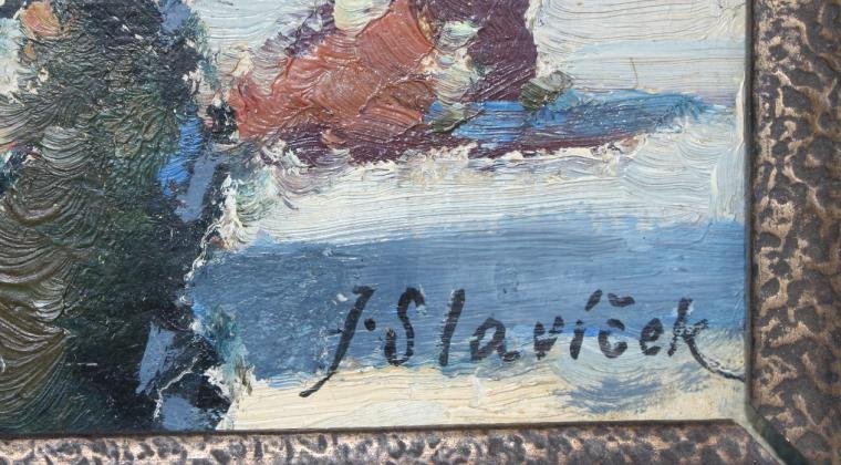 realistická malba s mírným nádechem imprese znalecký posudek č.588/2008 Realistická malba s mírným nádechem imprese. Středem pravé části obrazu probíhá horizont modrého moře s odleskem bílých a naoranžovělých plachet a světlomodrou oblohou s oblaky. V popředí kotvící bárky u žlutého písčitého břehu, jedna oplachtěná v popředí menší se staženými plachtami. V levé části dva bílé domky s červenou střechou a malými okénky. Typická venkovská přímořská obydlí na pobřeží Jugoslávie případně Řecka.