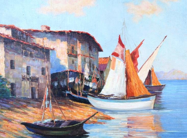Realistická malba s mírným nádechem imprese. Středem pravé části obrazu probíhá horizont modrého moře s odleskem bílých a naoranžovělých plachet a světlomodrou oblohou s oblaky. V popředí kotvící bárky u žlutého písčitého břehu, jedna oplachtěná v popředí menší se staženými plachtami. V levé části dva bílé domky s červenou střechou a malými okénky. Typická venkovská přímořská obydlí na pobřeží Jugoslávie případně Řecka.